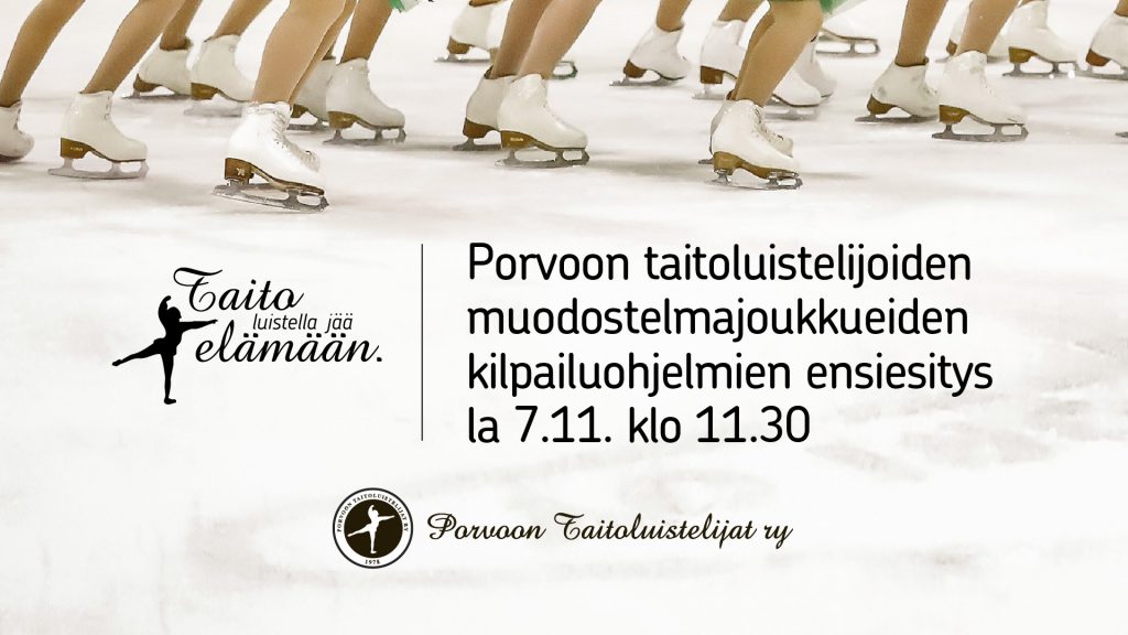 Muodostelmaluistelun Ensi-ilta Porvoon Jäähallilta näytetään maksuttomana suoratoistona kaikille kiinnostuneille yleisötilaisuusrajoitusten vuoksi lauantaina 7.11! Tervetuloa seuraamaan neljän muodostelmajoukkueemme huikeat esitykset klo 11.40
